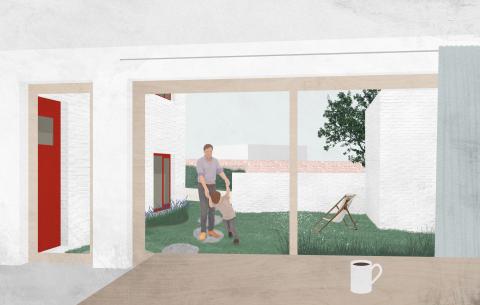 Kate Kerkhofs en Pieterjan Maes zetten het binnengebied in als groen woonerf. De open ruimte wordt gezien als een sequentie van groene buitenkamers, met een minimum aan verharding. Met het schakelen van doorzonwoningen rond een gedeelde buitenruimte zien zij kansen voor ontmoeting en collectiviteit. De volumes in het binnengebied blijven op respectvolle afstand van de perceelsgrenzen en werken de achterkanten van de woning in de Broekstraat af.