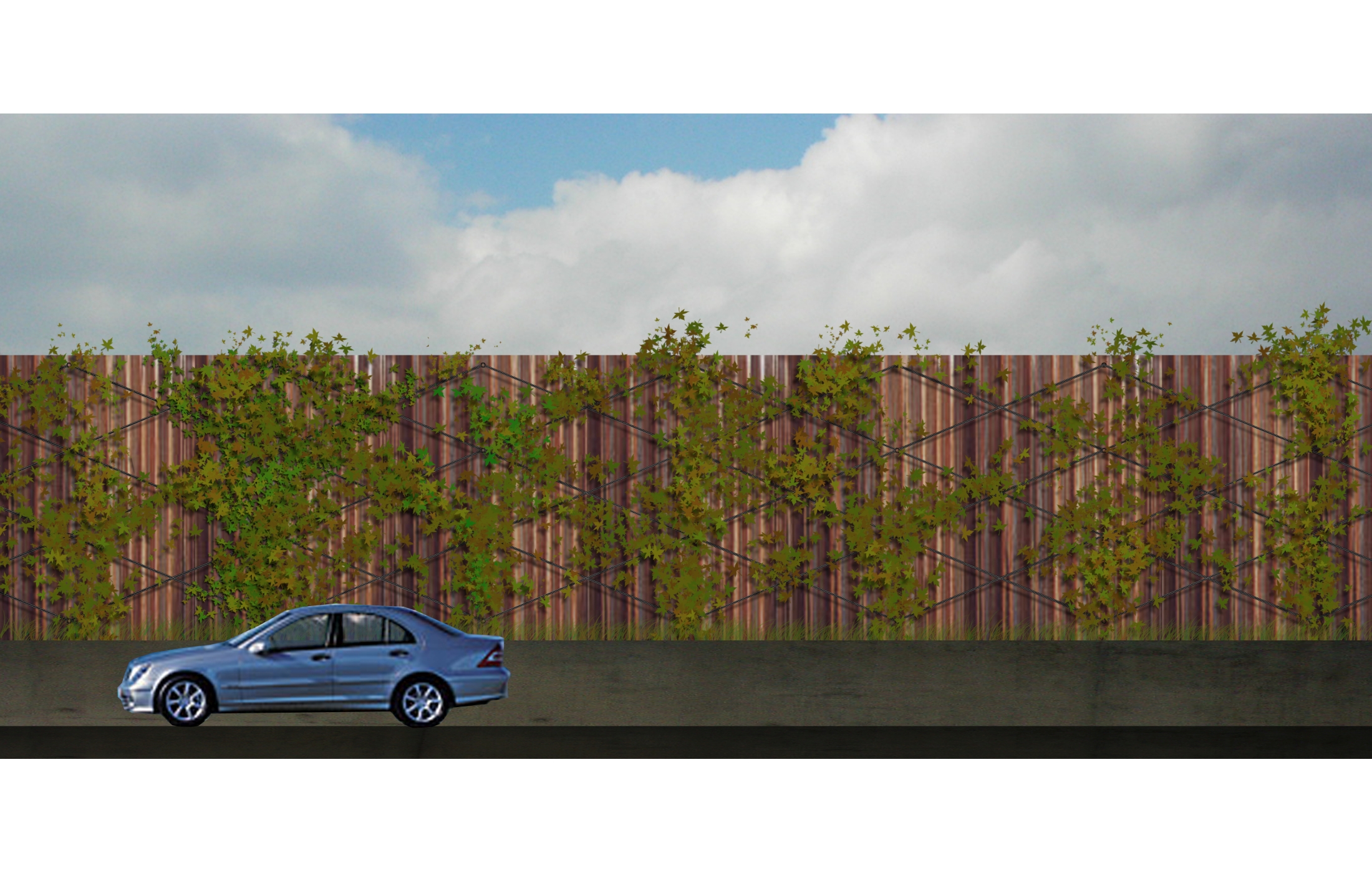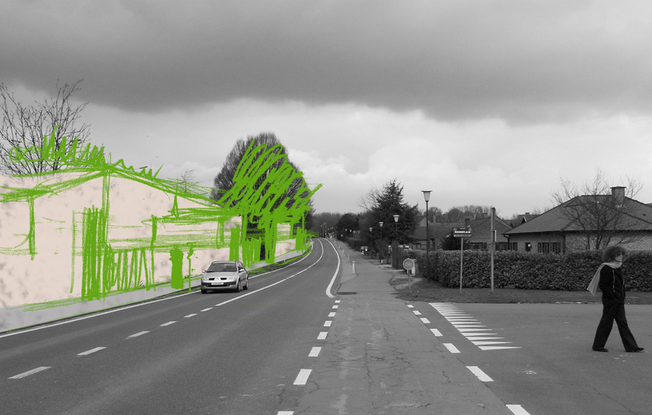 Een geluidswand wijzigt het landschap tweezijdig: langs de kant van de woonwijk, maar ook langs de snelweg. De akoestische oplossing tracht ook de visuele impact te ondervangen. De geluidswand is daarom opgebouwd uit cortenstaal en begroeid aan twee zijden. Hij volgt de glooiing van de autoweg en wordt gefragmenteerd in zones met een volle wand (waarachter de woningen) en zones met een lichte wand (waarachter de groene ruimtes). Langs de geluidswand is een pad in het landschap ingebed, dat aansluit op de voetgangersbrug naar de Plantentuin en Meise. Het loopt langs de tuinmuren van de nieuwe woningen, dan weer tussen de bomengroepen in de open ruimtes of langs de geluidswand en volgt de glooiing van de omgeving.