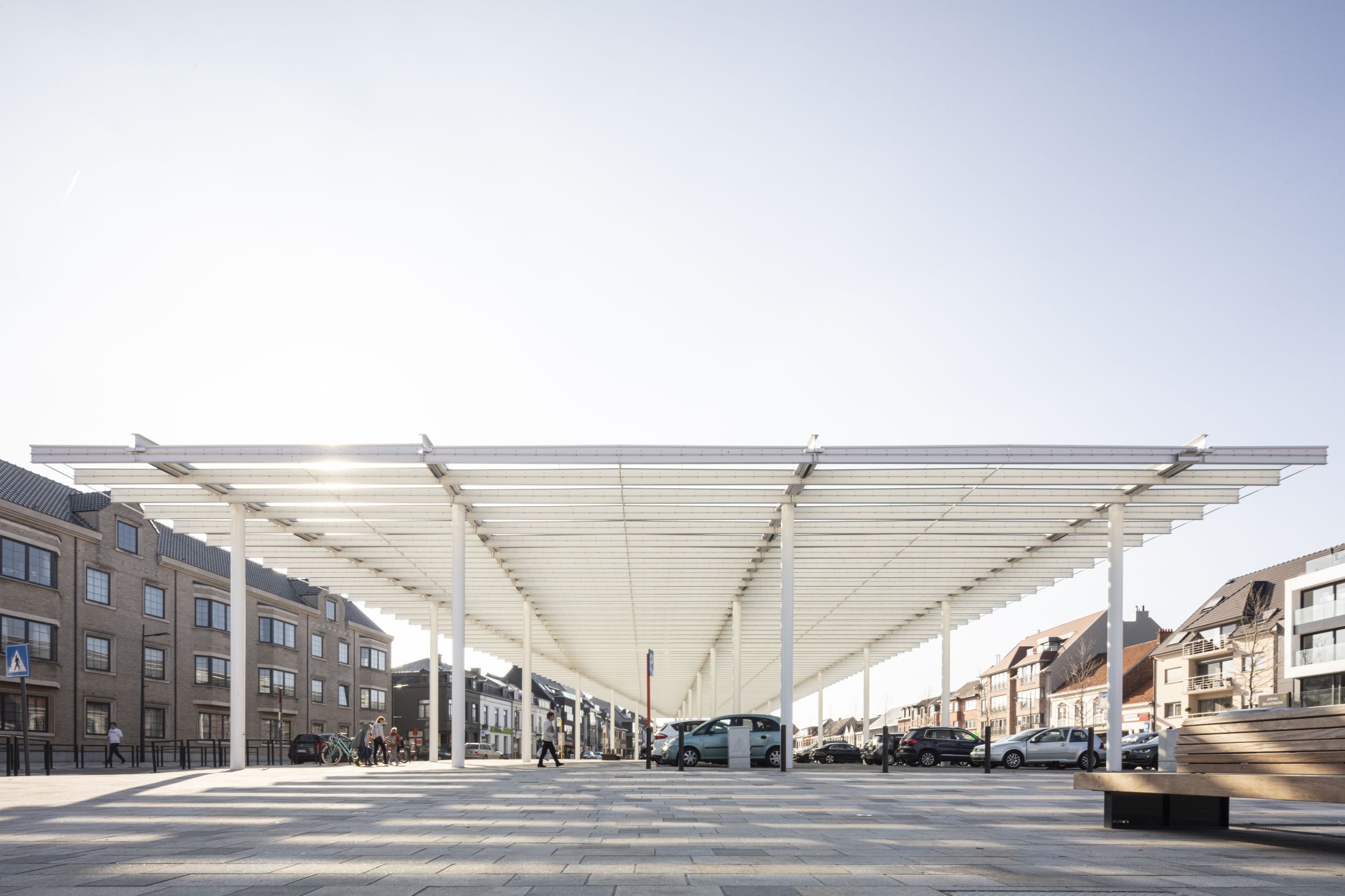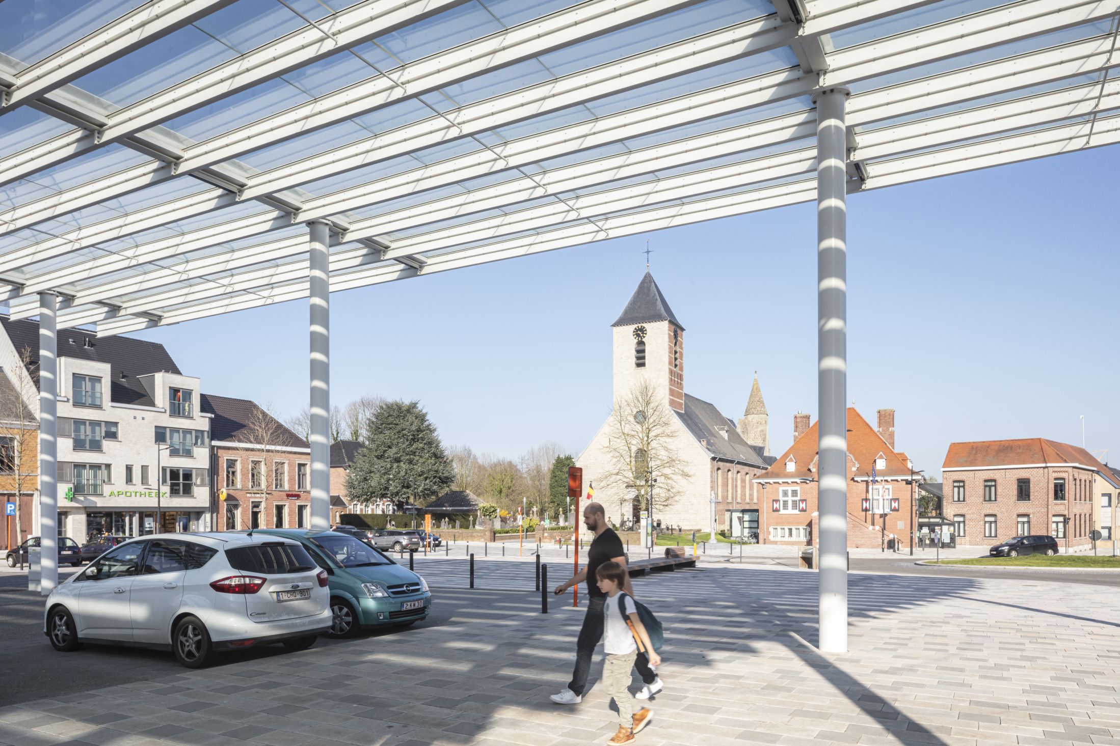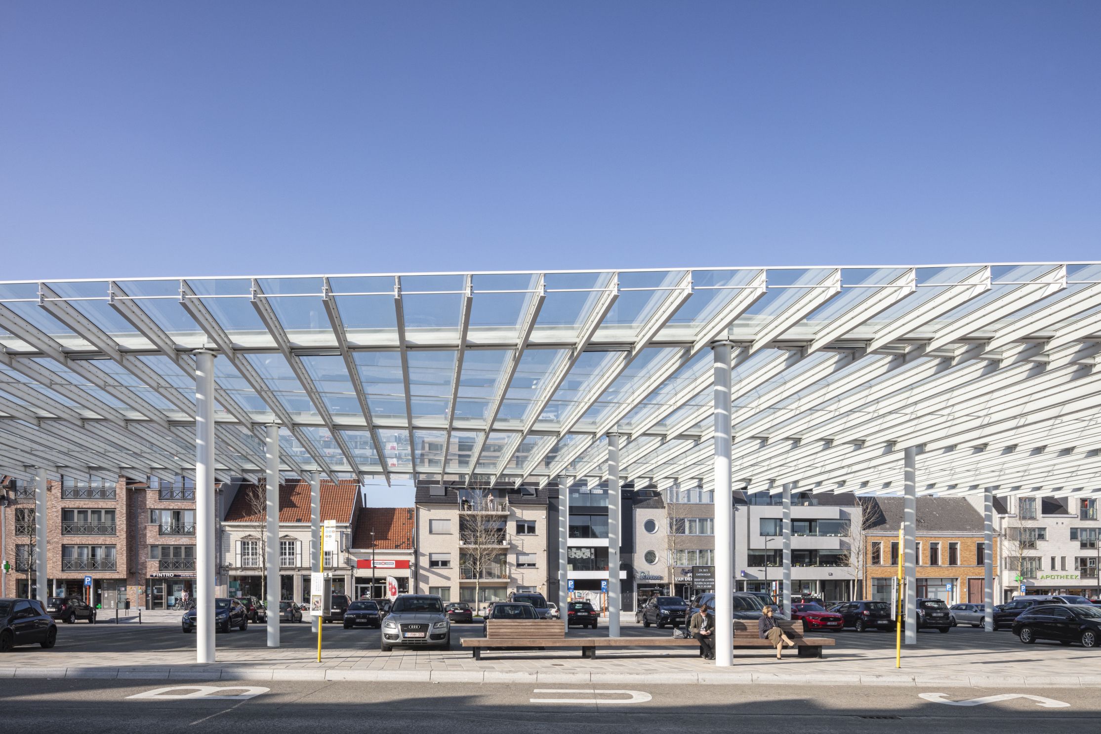 Aldus wordt het plein zelf ‘getekend’ vanuit de herkenbare aanwezigheid van horizontaal vlak en verticale rijen bomen, met die ene boom als contrapunt tegenover de kerk. Het Marktplein wordt gescandeerd in verschillende intervallen, visueel begrijpbaar, zonder echter afbreuk te doen aan de totaliteit van het plein zelf. Maar één langse loop- en zitzone (terrassen) aan de noordzijde van het plein (en dus belicht met zuiderzon) houdt het plein aan elkaar. Een gegeven grote ruimte splitst men niet op: hier wordt ‘perk en paal’ gesteld aan de verkavelingspolitiek. Deze intervalreeks is duidelijk ervaarbaar in een opengelegd rioleringssysteem waarbij op specifieke plekken het hemelwater zichtbaar wordt, waar het geluid van waterstromen hoorbaar is en waar een opvangbekken gebruikt wordt als bassin, als bekken of als drinkbak. Plaats en tijd in één structuur gevat.