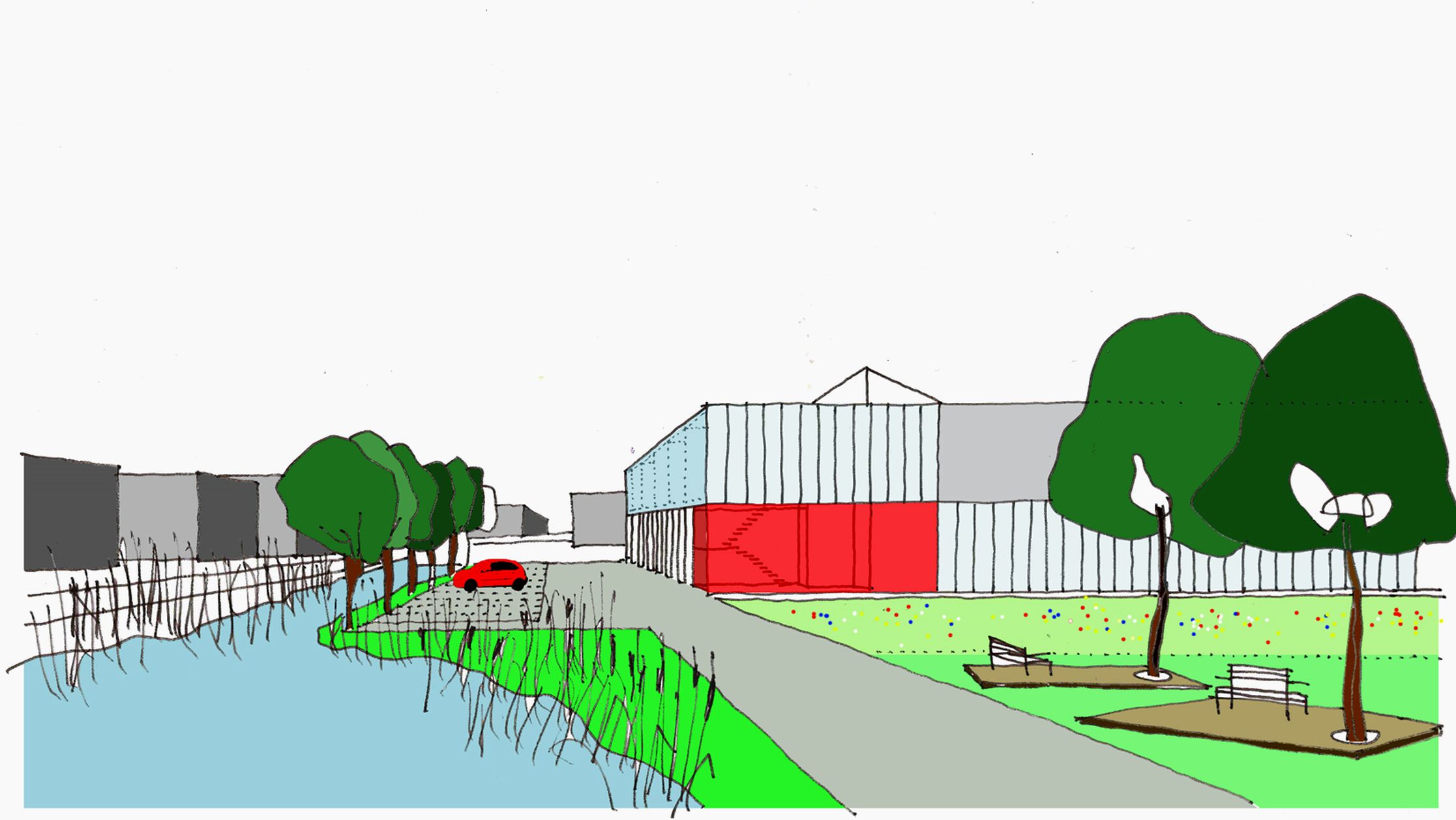 Het project staat niet alleen. De context bepaalt het project. Het project zal op zijn beurt de context herbepalen. Er werd gezocht naar een project dat een meerwaarde genereert voor zijn omgeving, dat verder reikt dan het eigen perceel. Het versterken van een groen raamwerk waar rust en stabiliteit heerst (water, groen, recreatie) tegenover het rode netwerk van hoogdynamisch functies (verkeer & bebouwing) is daarbij een belangrijke sleutel. Het benutten van lokale ecologische potenties en de introductie van plekken en verblijfsruimtes -een recrea-tieve component langs dit groene raamwerk- leidt tot een gezondere en kwalitatieve omgeving en tot een sterke samenhangende identiteit.