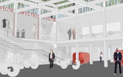 Download ontwerpvisieHet ontwerp gaat uit van een optimalisatie van de interne organisatie. De huidige gefragmenteerde binnenruimte wordt door het verschuiven van centrale opstakels en het verplaatsen van functies beter gestructureerd. De toegangen worden geaccentueerd. De gefragmenteerde vide transformeert in een eenduidige open vide waar contact met de onderliggende ruimte mogelijk is. Uit deze zoektocht naar een nieuwe identiteit ontstaat een gemoduleerde binnenruimte welke geaccentueerd wordt in het geheel door gebruik van gladde texturen en architectonisch beton, en een dominante kleurkeuze. De gevelbehandeling voorziet in een nieuwe buitenhuid met houten beplanking.