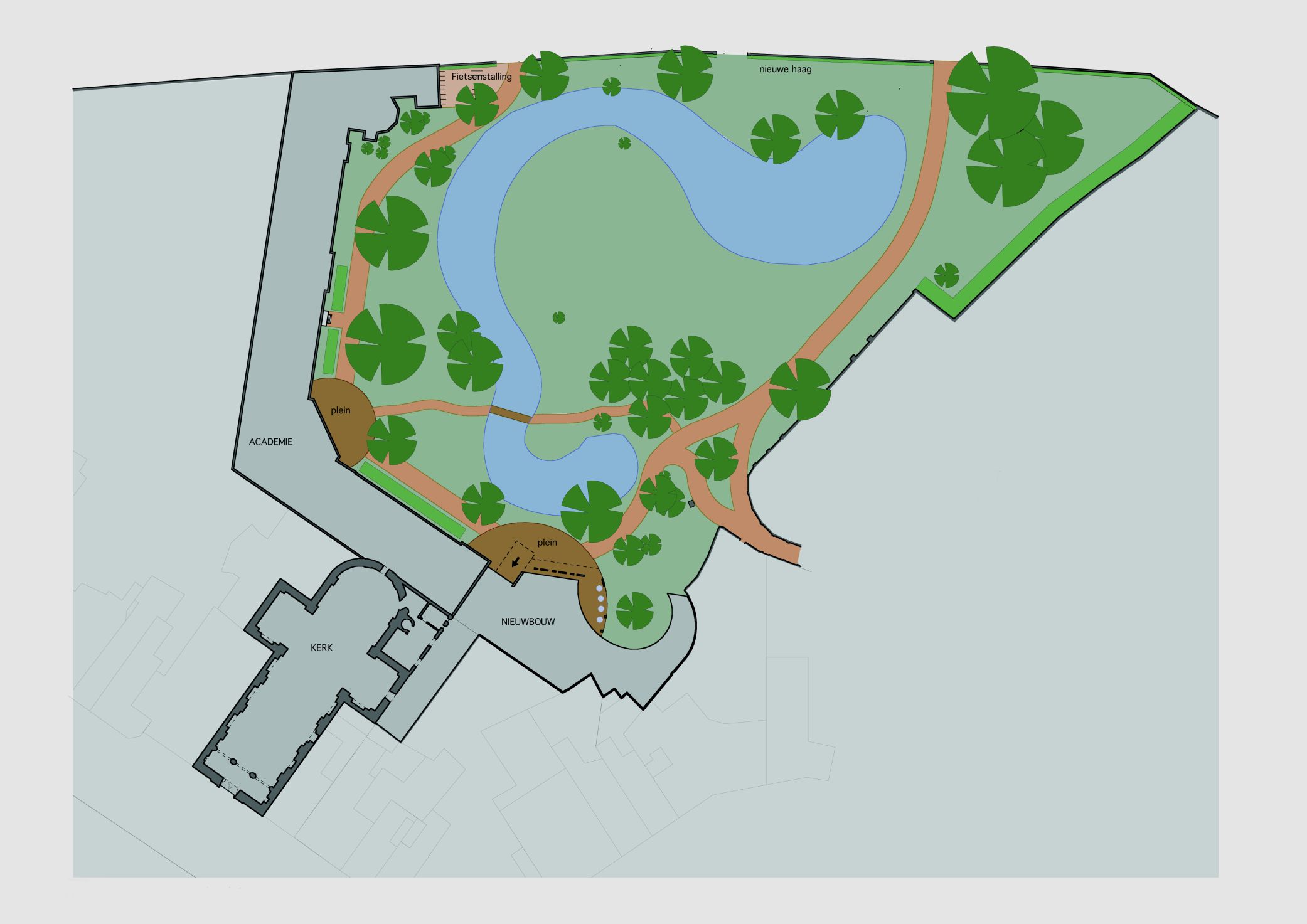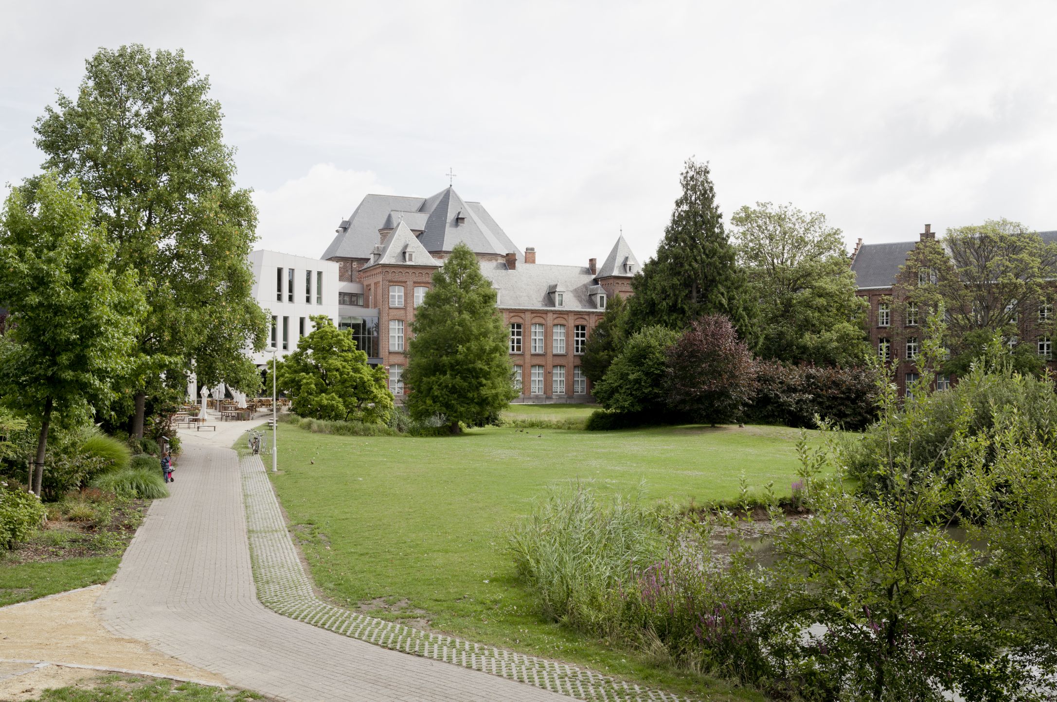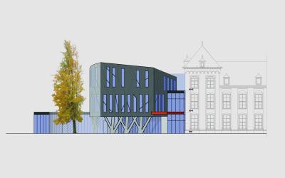 Download ontwerpvisieHet ontwerp voor de nieuwbouw vertrekt van het geheugen van de plek. Natuurlijke vormen creëren de basis van het hoofdvolume. De oude, gesloten transcendentale sfeer wordt omgezet naar licht(heid). Het café-foyer plooit zich in een curve rond de oude Ginkgoboom. De toegang wordt ondergebracht in een glazen passage tussen de historische architectuur en de nieuwbouw. De leslokalen worden logisch toegevoegd door het doortrekken van de bestaande gangen. De raamindeling volgt de functie: groot waar uitzicht belangrijk is, friezen waar enkel licht nodig is. Het park wordt door een open vormgeving met veel glas visueel geïntegreerd. De organische vormgeving ondersteunt de akoestische functies.