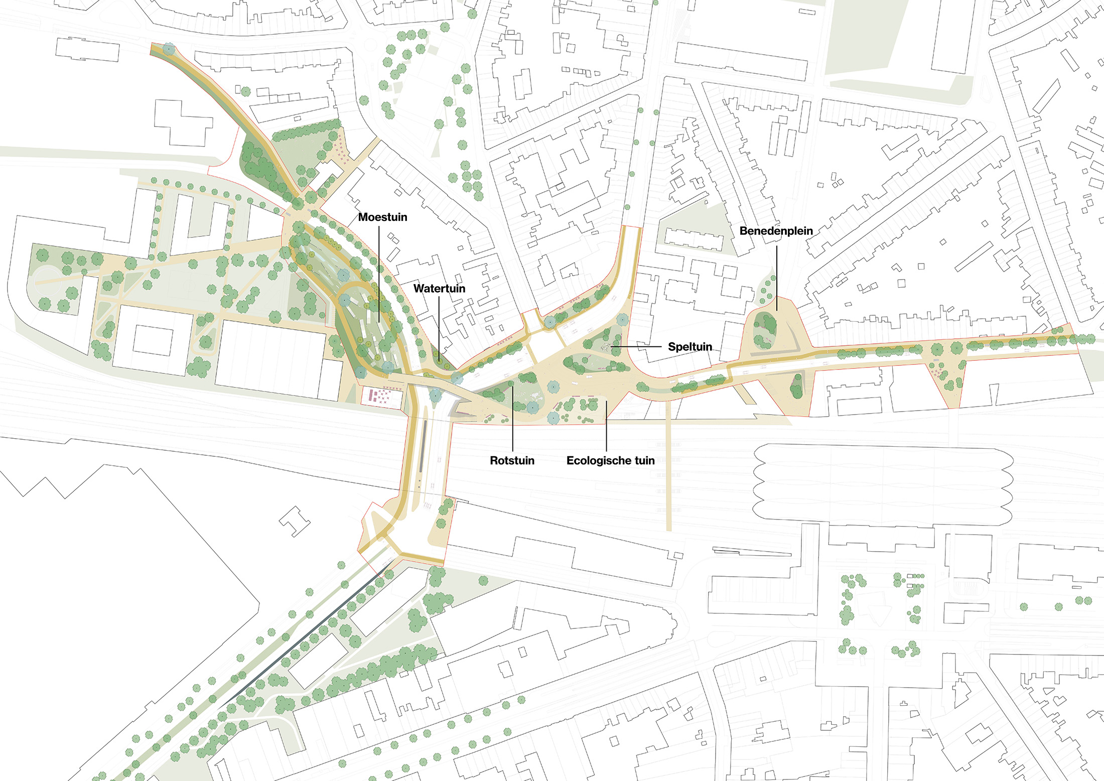 Een van de belangrijkste ontwerpkeuzes is het loskoppelen van de nieuwe brug over de Diestsesteenweg en de spoorbrug. Hierdoor kunnen fietsers en voetgangers genieten van een rijker uitzicht. De site wordt versterkt door een variatie aan tuinen die het parklandschap vormen.
